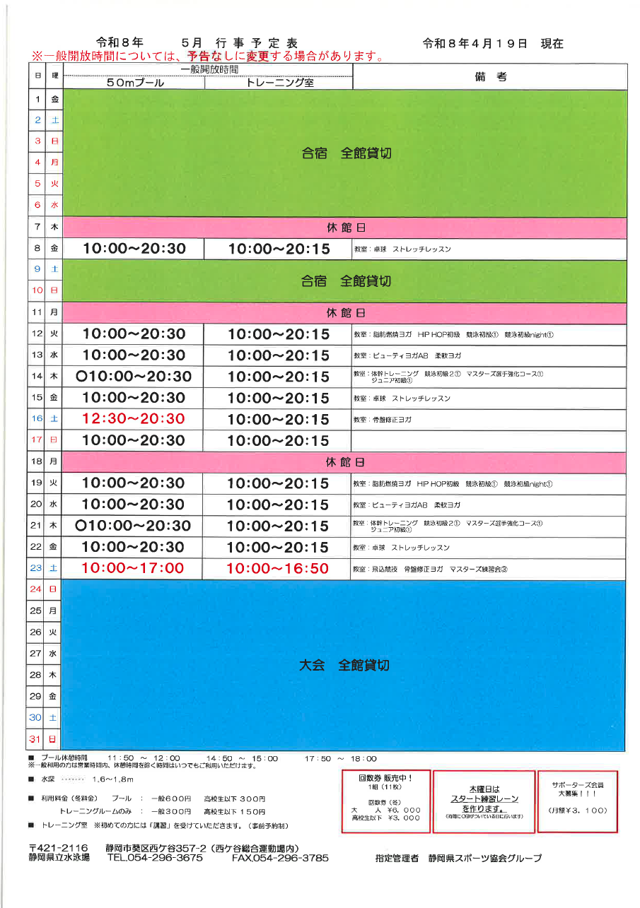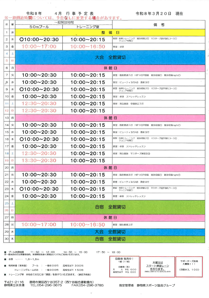 月別予定表を掲載いたします。専用使用に関しましては、急な変更が生じることが多く、更新が間に合わないことがありますので、来場の折に掲示している予定表でご確認いただきますようお願い申し上げます。